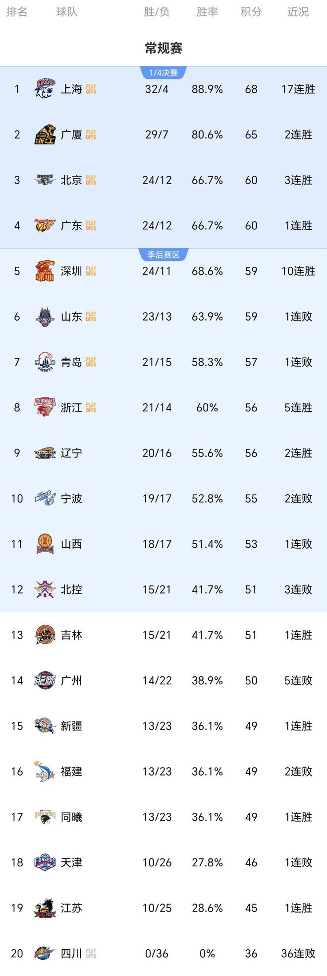 随着上海17连胜,广东逆转青岛+广厦掀翻山东,CBA积分榜一夜乱了